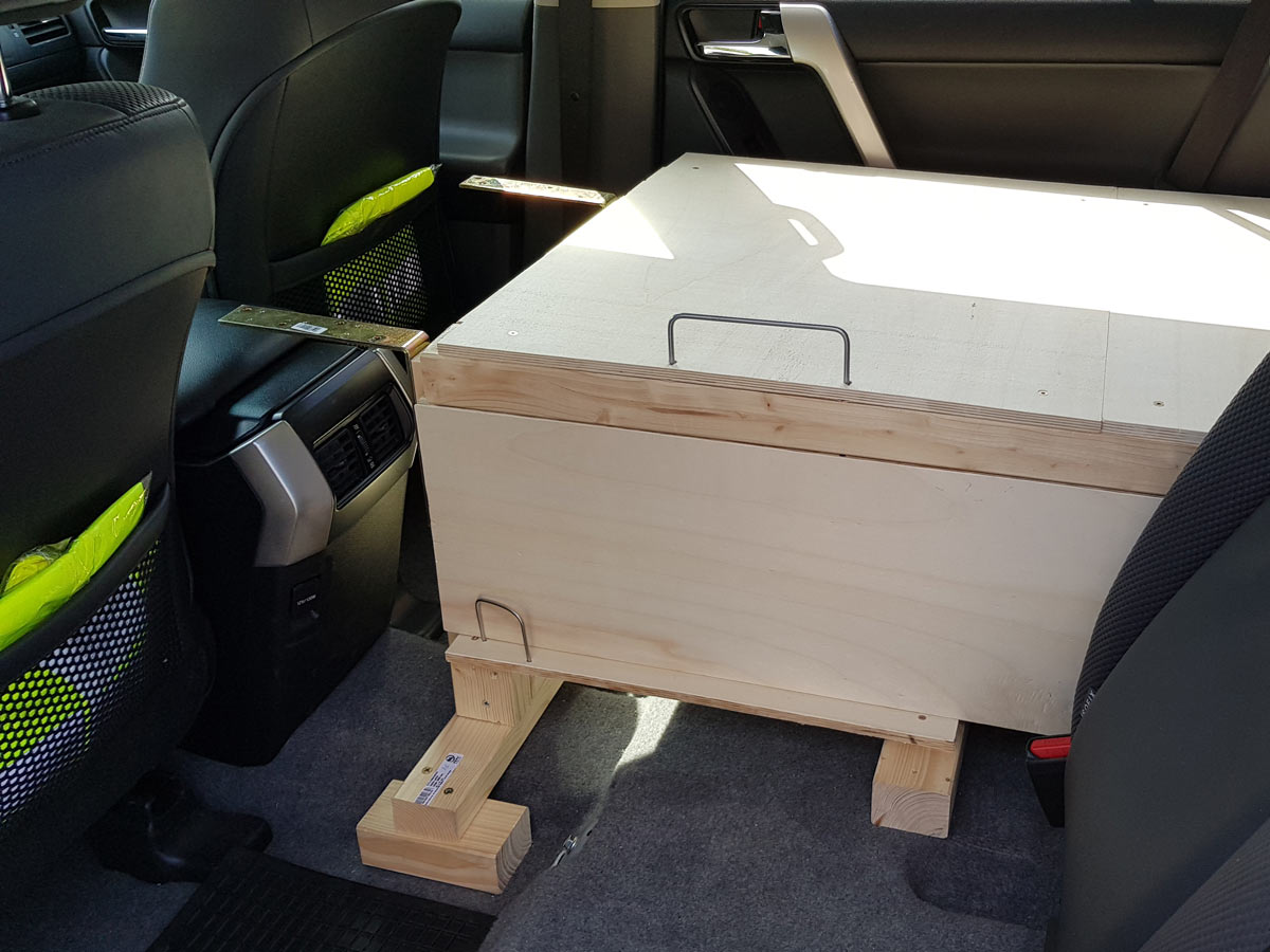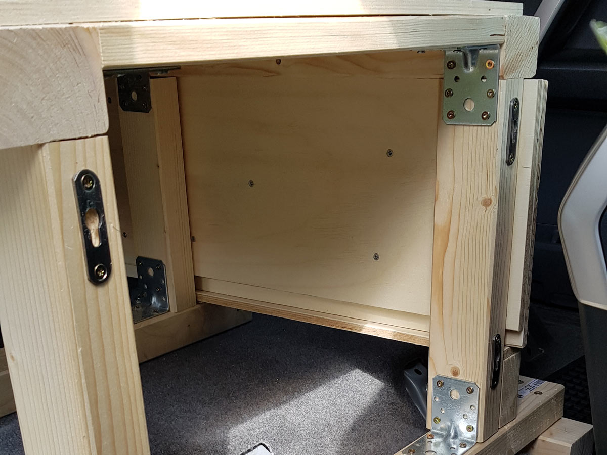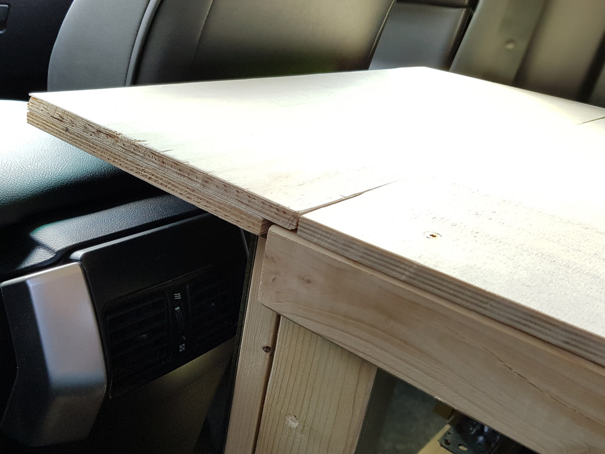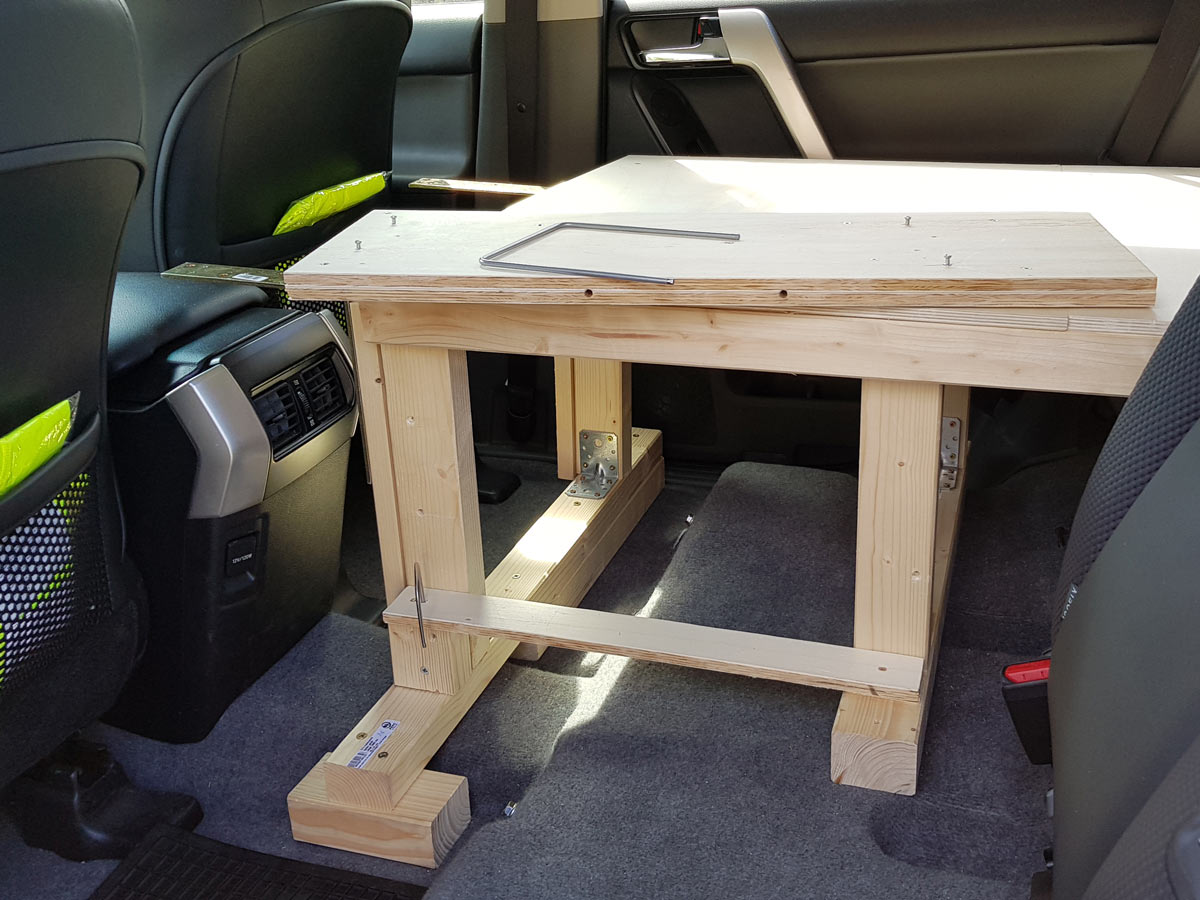 Der beste Platz der sich anbot, war der untere Bereich neben dem Rücksitz. Hier hatten wir sowieso noch die Aufgabe, die dort verstauten Gegenstände zu sichern. Also zwei Fliegen (Aufbewahrung und Sicherung) mit einer Klappe. Um die Platte auf einer Höhe zu halten, befestigten wir darunter eine passgenau zugeschnittene Sperrholzplatte. Zur Fixierung wählten wir zwei Metallbügel. Der Obere ist ca. 10 cm tief in die Platte eingelassen. Der Unteren kann seitlich weggeschwenkt werden um das Kopfteil zu entnehmen. Das Material kam aus der 'Das-kann-man-vielleicht-noch-einmal-für-irgendetwas-brauchen'-Kiste.