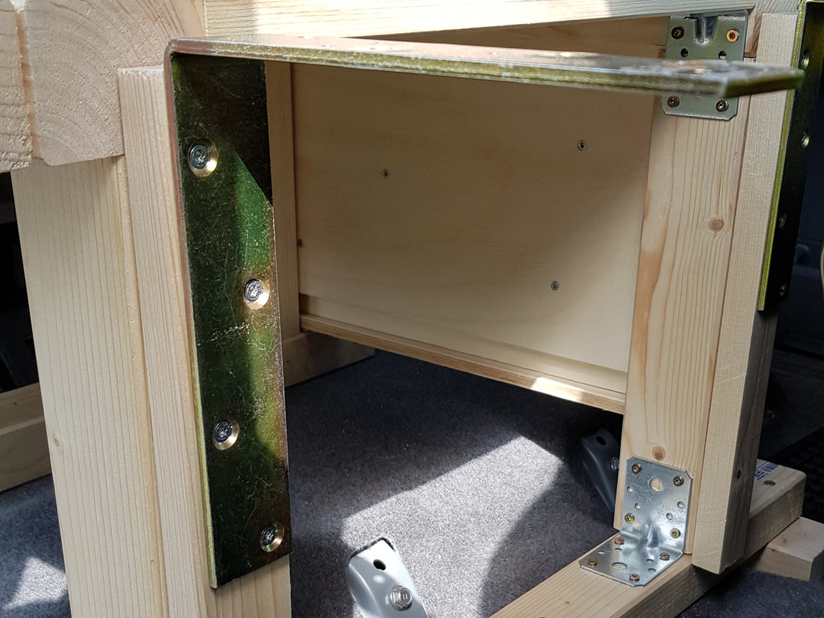 Wir besorgten im Baumarkt eine weitere Sperrholzplatte (1.200 x 600 x 12 mm). Die beiden Winkel und genügend Schrauben hatten wir bereits. Aus dem vom Grundgerüst übrigen Holz, schnitten wir mit der Akku Handkeissäge passende Rahmen. Die Stahlwinkel wurden mit jeweils 4 Schrauben daran befestigt. Auf die Rückseite kamen zwei Schrauben in den zu den Linsenkopfbeschlägen passenden Abstand.