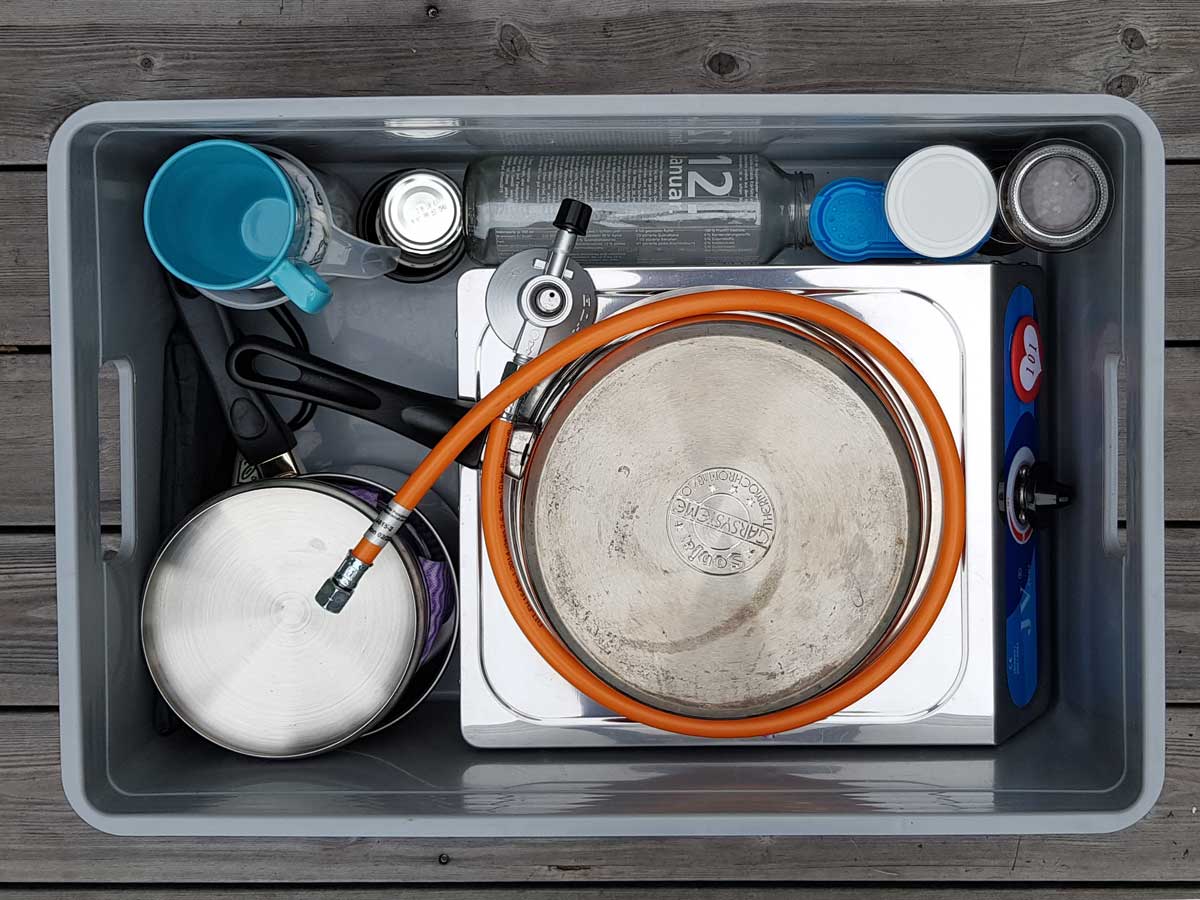 Meine Campingküche wollte ich in zwei grauen 45 l Euroboxen (Maße 60 x 40 x 22 cm) unterbringen. Der Campingkocher passt mit seinem Maß von 41.3 x 30.9 x 12.5 cm perfekt hinein. Auch die 3 kg Gewicht sind angenehm leicht, sofern man wie ich mit dem Auto unterwegs ist.