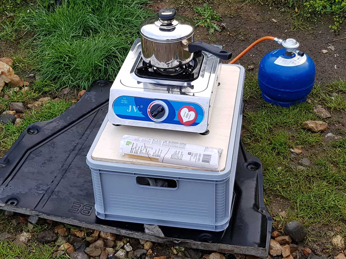 Der Vollständigkeit halber, möchte ich erwähnen, dass ich vor der Reise auch einen faltbaren Aluminium Windschutz erworben hatte. Das ist jedoch ein Teil, das die Welt nicht braucht - zumindest nicht die Welt, die Island bereist. Billig, wackelig und für diesen Kocher und Einsatzzweck absolut unbrauchbar. Was gut funktioniert hat, war das Auto als Windbrecher zu benutzen und aus den Deckeln und der zweiten Eurobox eine Umrandung für den Kocher zu bauen, die den Wind einigermaßen abhielt.