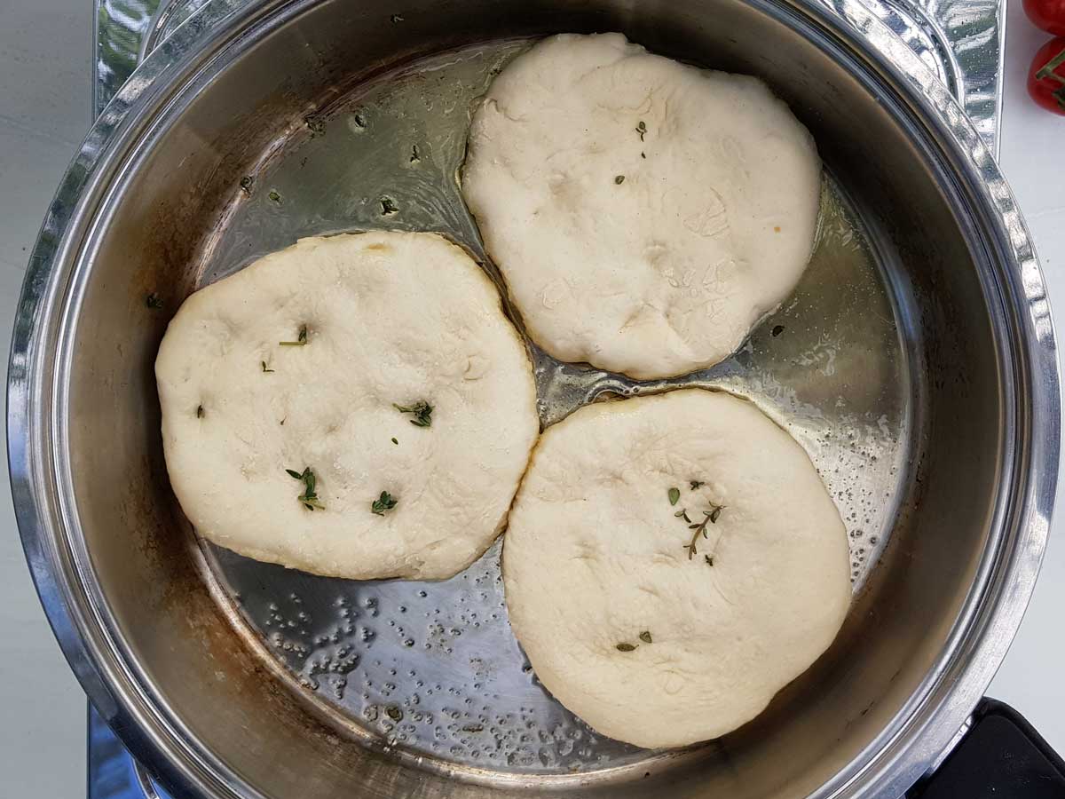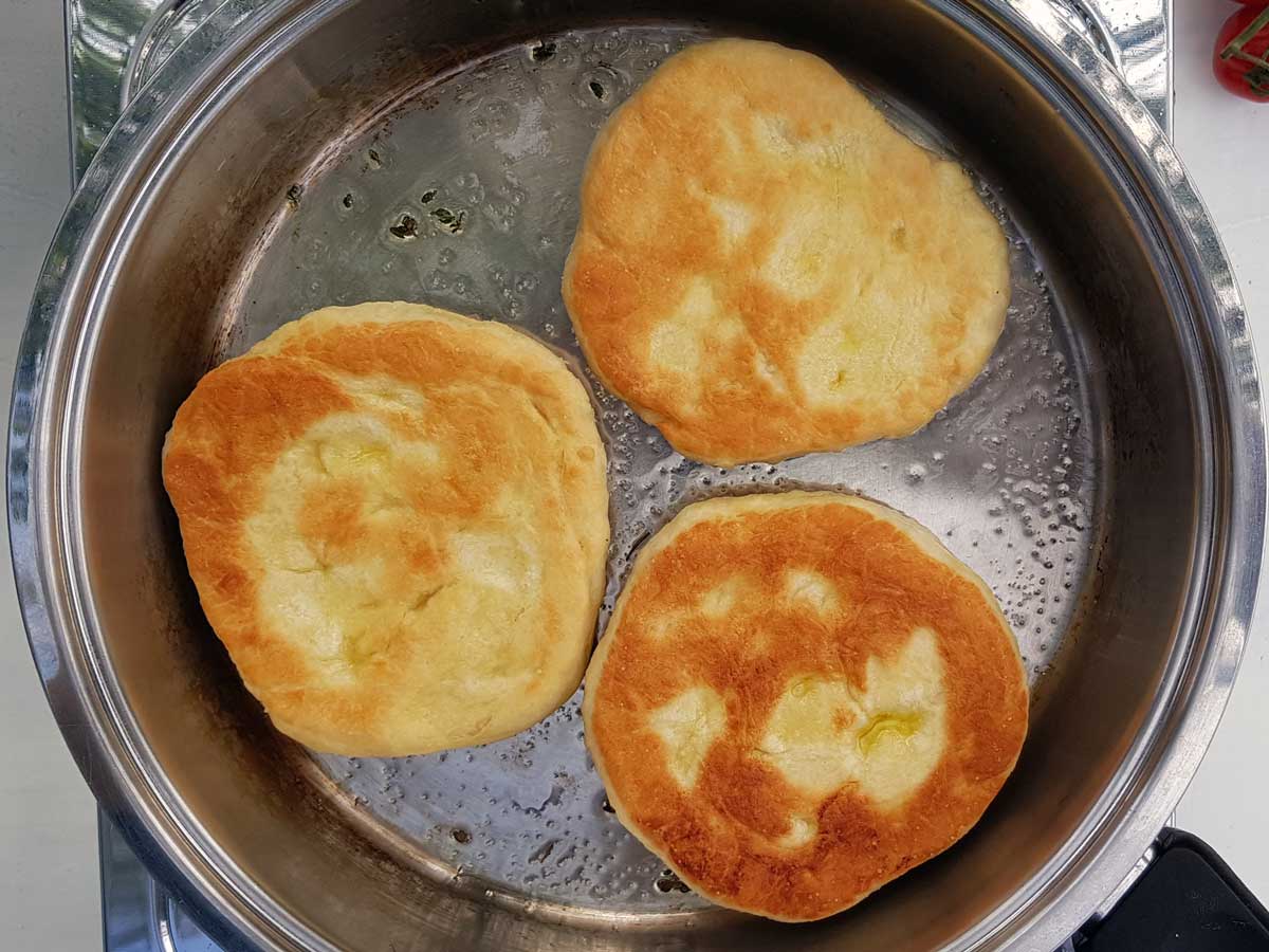 Das Rezept für den Hefeteig findet ihr unter Naan- Fladenbrot Rezept. Aus dem fertigen gegangenen Teig kleine Fladen formen. Etwas salzen und in der Pfanne mit reichlich Olivenöl auf beiden Seiten goldgelb backen.