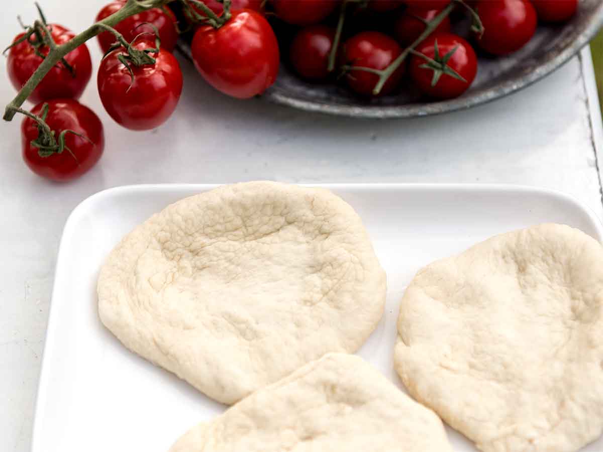 Das Rezept für den Teig der abgebildeten Fladenbrote findet ihr unter: Naan- Fladenbrot Rezept. Bitte beachtet, dass der Hefeteig ca. eine Stunde vorher angesetzt werden muss.