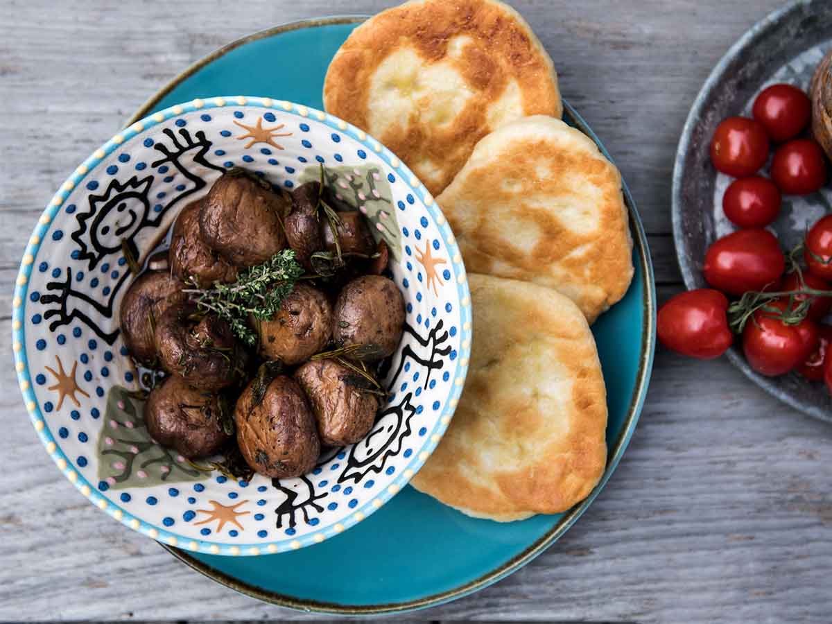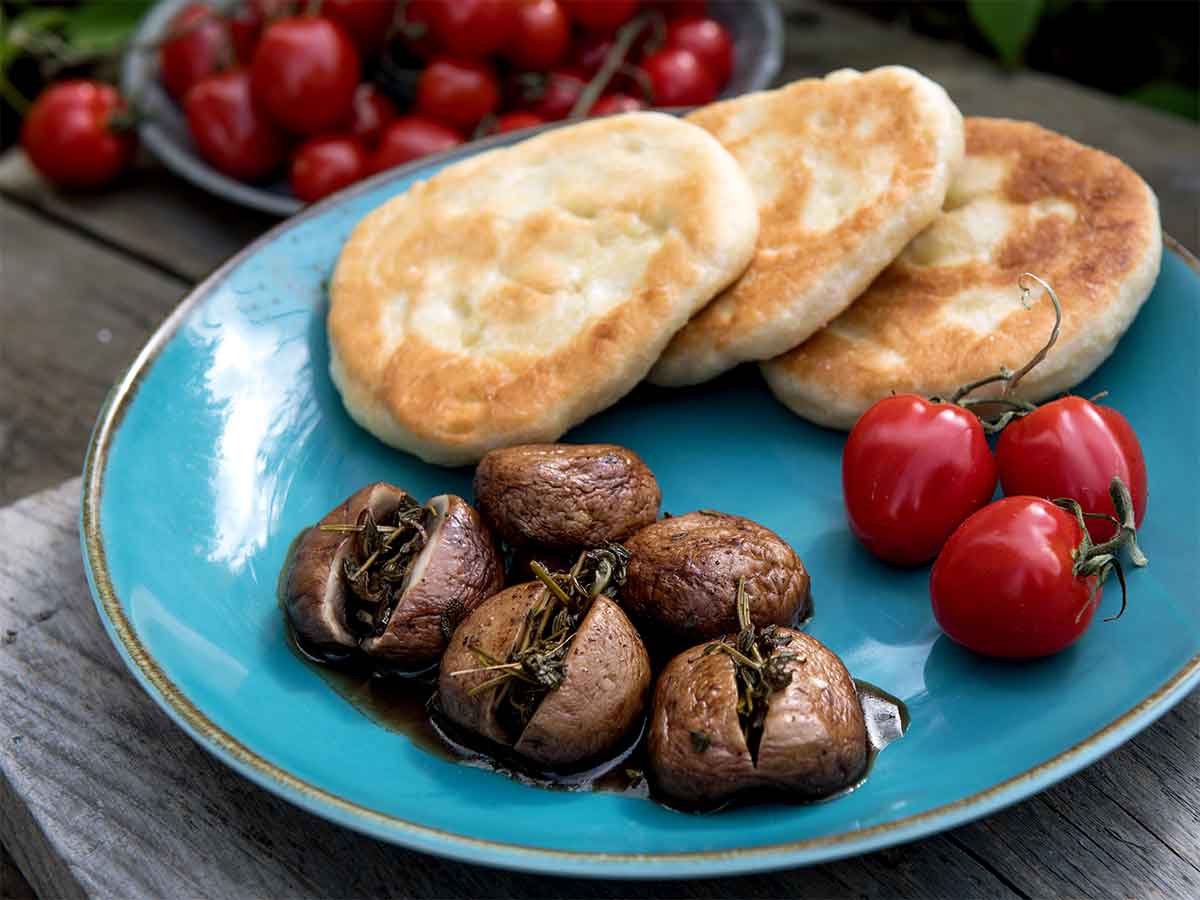 Die Pilze auf einen Teller geben. Jeweils in der Mitte anschneiden und mit Kräutern füllen. Die Soße darüber träufeln. Mit dem Brot und ein paar Tomaten genießen.