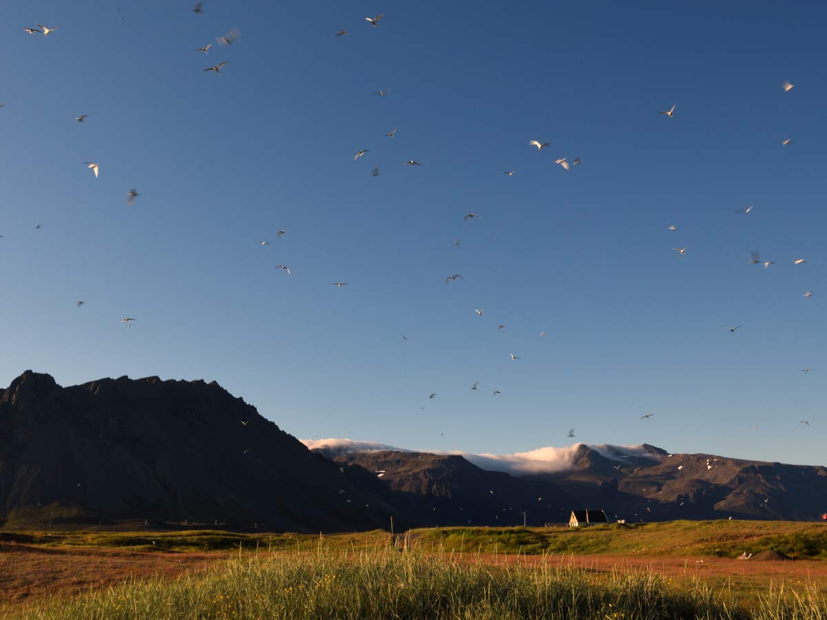 Es war Juli. Die Mitternachtssonne strahlte verführerisch vom Abendhimmel und so beschloss ich noch ein paar Bilder vom Strand und dem Snæfellsjökull in der Ferne zu machen. Vor mir liefen ein paar Leute mit aufgespannten Regenschirmen und genossen wie ich den traumhaften Sommerabend. Zugegebenermaßen wunderte ich mich ein wenig über die Schirme, dachte mir aber nicht wirklich etwas dabei. Nach einem guten Kilometer bogen die vier auf eine Wiese ab, um querfeldein zur Unterkunft zurück zu gelangen. Das war der Moment, an dem ich die kommende Erfahrung noch vermeiden hätte können. Aber nein, ich bin im Abstand von ca. 200 m einfach hinterhergelaufen.