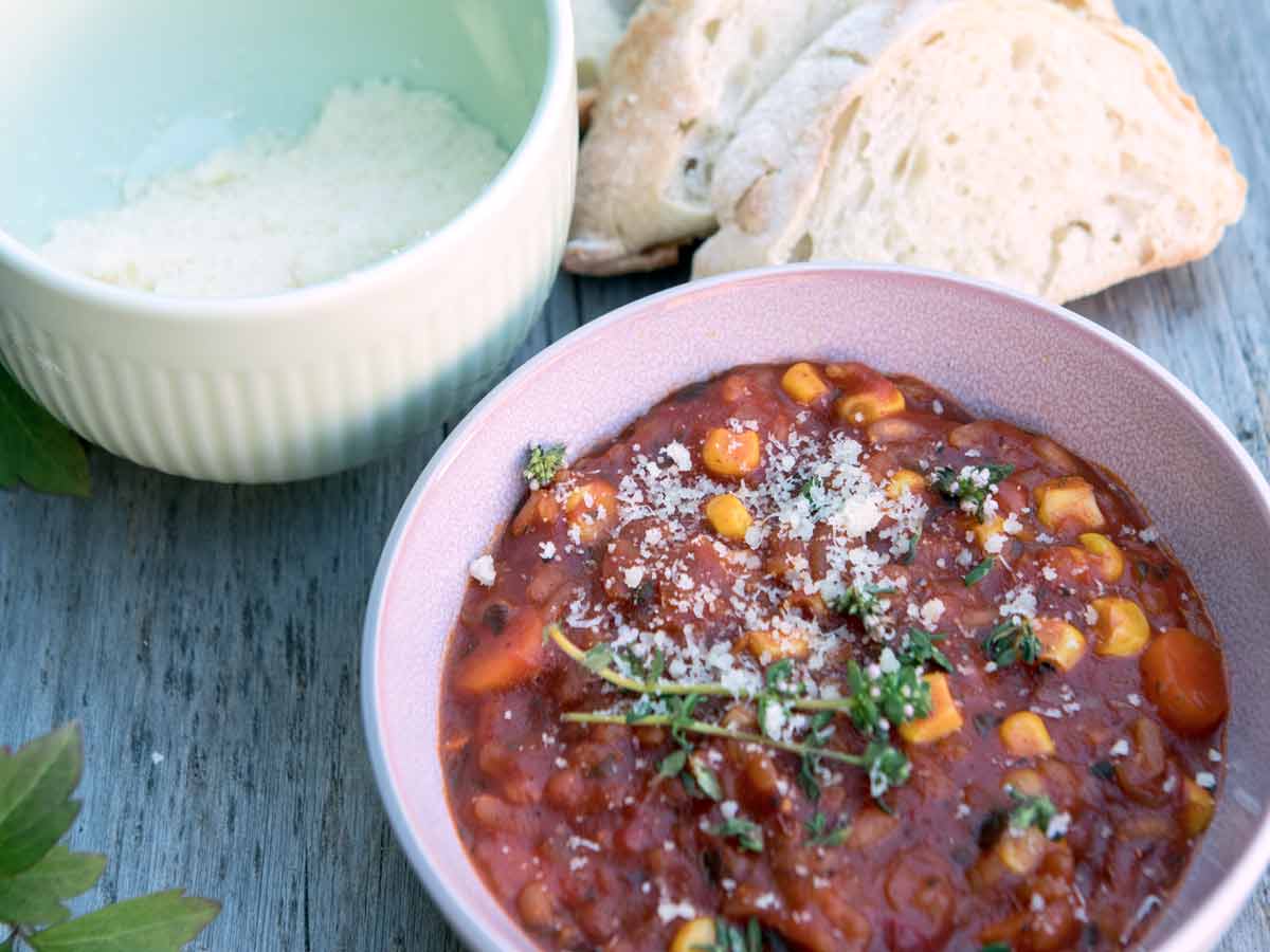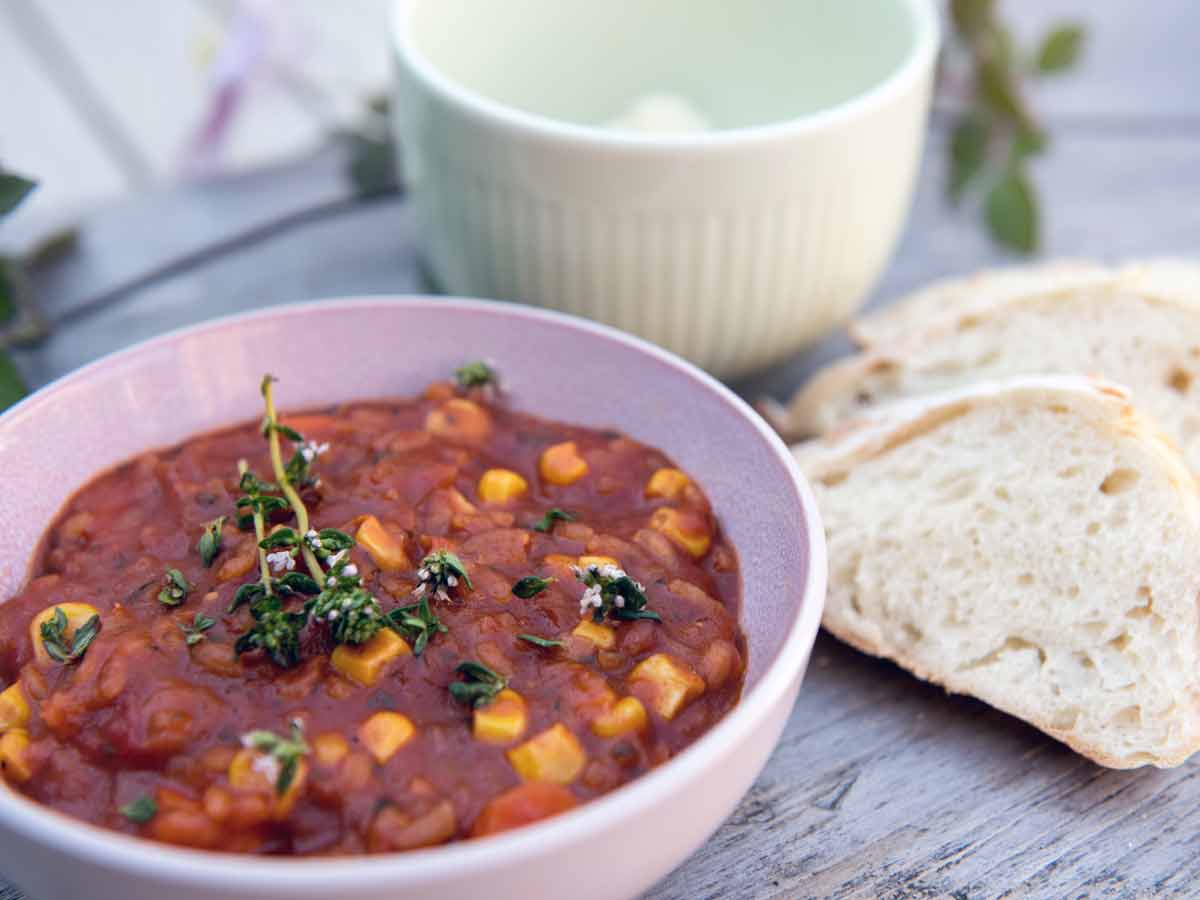 Mais zugeben und weitere 5 Minuten auf unterster Stufe ziehen lassen. Mit frischem Thymian und Parmesan bestreut servieren. Dazu passt frisches Baguette und Salat.