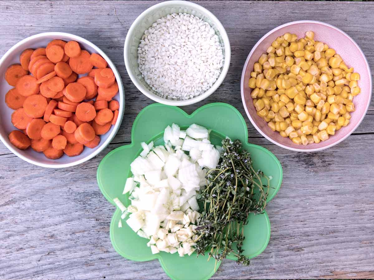 Den Reis waschen. Zwiebeln und Knoblauch fein schneiden. Die Möhren schälen und in feine Scheiben schneiden. Die Maisdose öffnen und die Flüssigkeit abtropfen lassen.