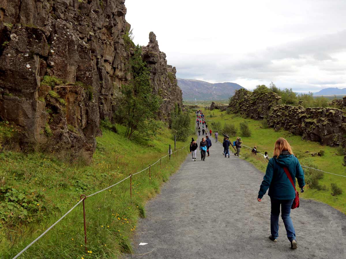Gleich hinter dem Visitor Center am Eingang des Thingvellir-Nationalparks erwartet euch die Almannagjá. Diese markante Schlucht erstreckt sich über eine beträchtliche Länge und wird von steilen Felswänden gesäumt. Während ihr hindurch wandert, eröffnet sich euch ein beeindruckender Blick auf die geologischen Kräfte, die die Landschaft Islands geformt haben. Die Schlucht dient als sichtbares Zeichen für die Kontinentalverschiebung – hier sind die amerikanische und die eurasische tektonische Platte um 70 Meter auseinander gedriftet, und der Talboden hat sich um etwa 40 Meter gesenkt. Ein Spaziergang hier ist ein Gang zwischen den beiden Kontinenten.