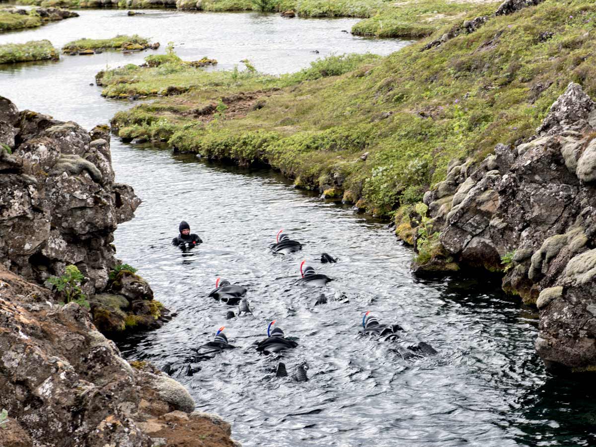 Die Silfra-Spalte (Silfra ‚Silberne Frau') ist eine weltweit einzigartige Tauchgelegenheit. Genau wie ihr in der Almannagjá zwischen den Kontinenten spazieren könnt, könnt ihr hier in den Gewässern Islands zwischen den Kontinenten tauchen. Erlebt das einzigartige Gefühl, unter Wasser mit der Hand Amerika und mit der Flosse Eurasien gleichzeitig zu berühren. Taucht ein in die Gewässer Islands, die für ihre bemerkenswerte Klarheit bekannt sind und Sichtweiten von bis zu 100 Metern bieten. Ob erfahrener Taucher, Fotograf, neugieriger Reisender oder Abenteuerliebhaber – ein begleiteter Tauchgang in die Silfra-Spalte bietet für jeden von Euch die Möglichkeit, zwischen den Kontinenten zu tauchen. Schnorcheltour Silfra-Spalte »